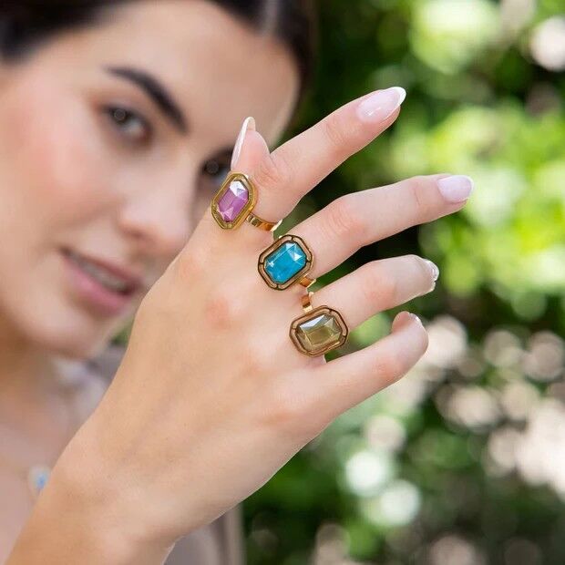 Anillo de acero quirúrgico y baño de oro amarillo 18 quilates, de la firma Anartxy, con un cristal iridiscente. Anillo ajustable. Talla única.