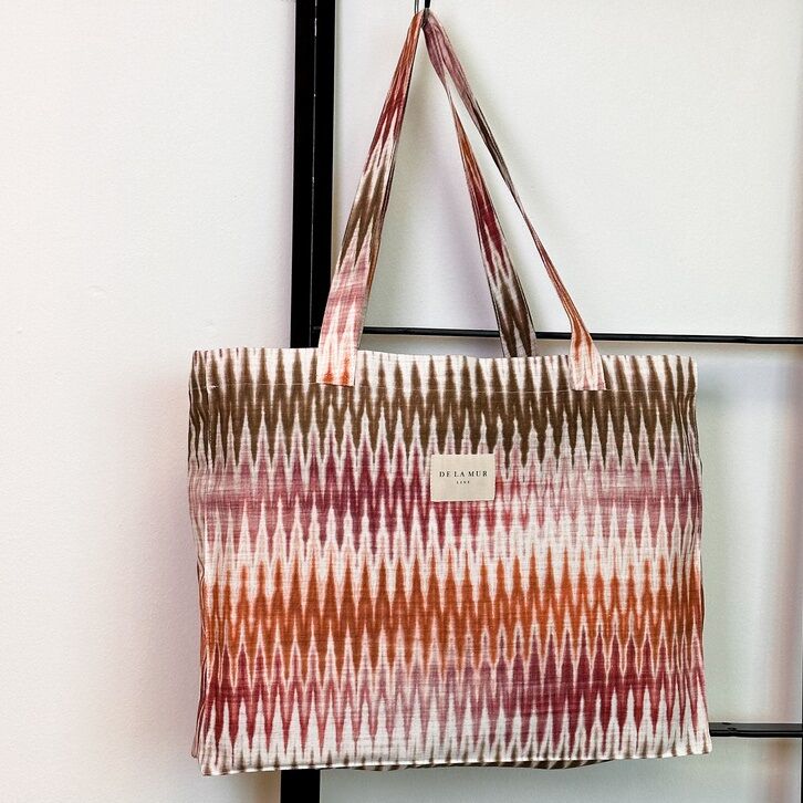 Bolsa tela rectangular de la firma española De la Mur, tejdo estampado con dos asas para llevar al hombro.