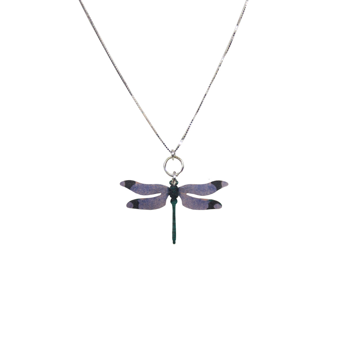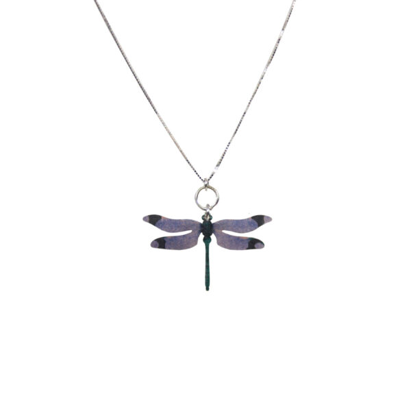 Colgante en piel estampada con forma de libélula y cadena de plata.
