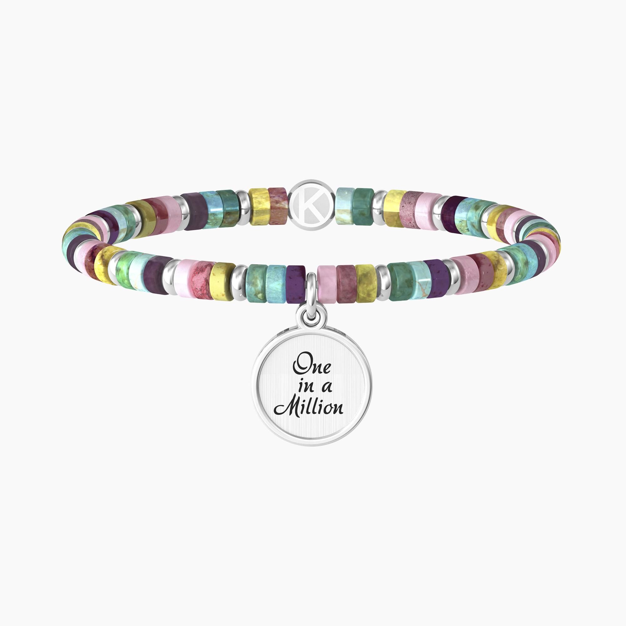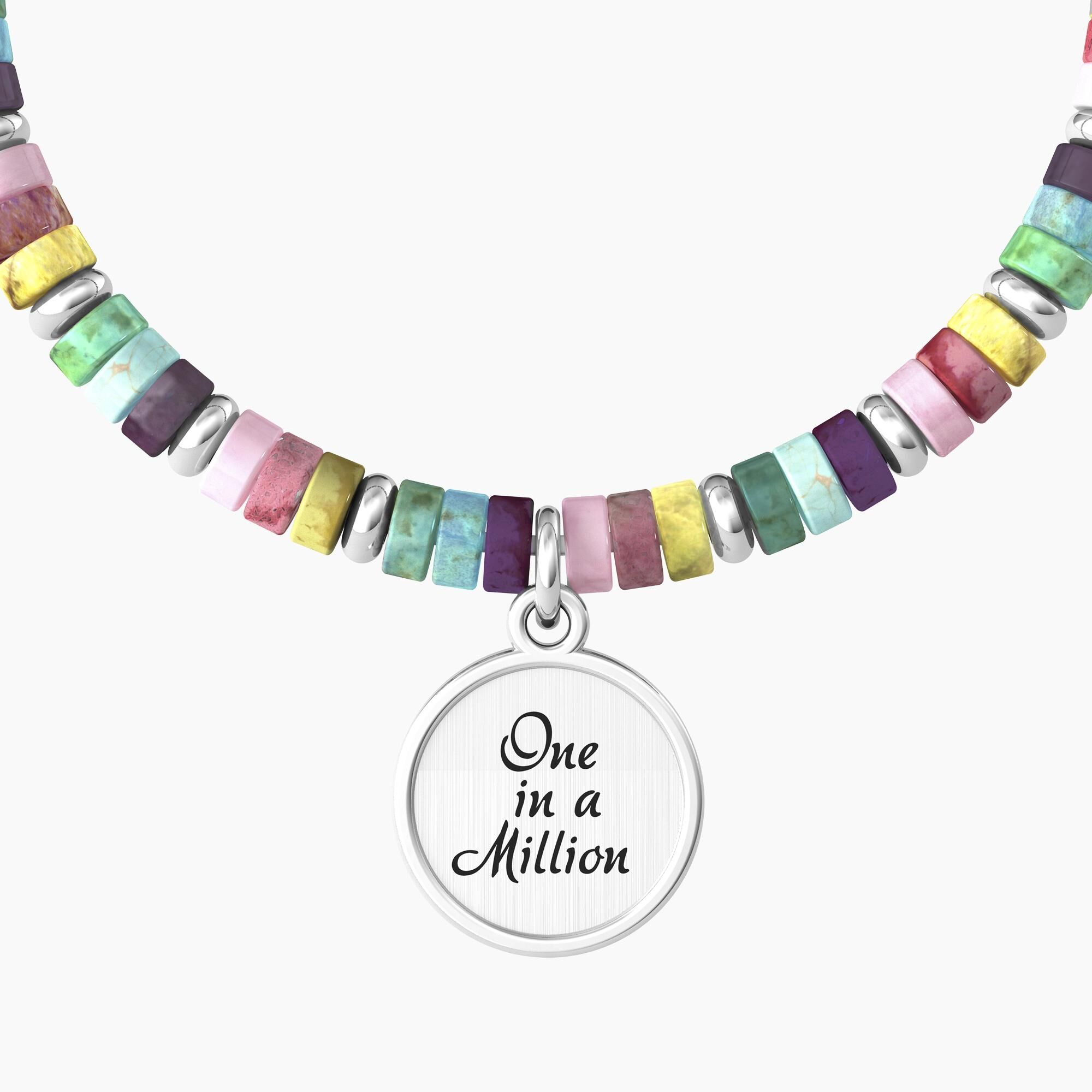 Pulsera elástica con cilindros de piedras multicolor alternados con anillos de acero y colgante satinado redondo.