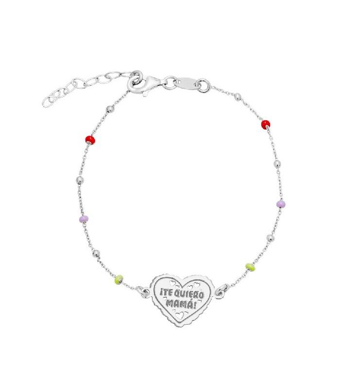 Pulsera de plata 925 rodiada, de la firma Pilar Breviati, cadena bolitas esmaltadas con un corazón y el mensaje ¡Te quiero mamá!. Pulsera de 17cm +3cm de extensión. Cierre mosquetón. Colección Essential. Perfecta para llevar sola o con varias pulseras.