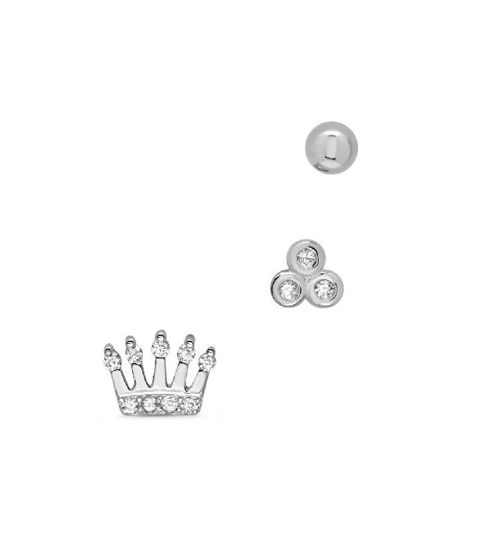 Pack pendientes de plata 925 rodiados, de la firma Pilar Breviati, formado por tres pendientes; coronas, circonitas y bolita. Cierre presión.